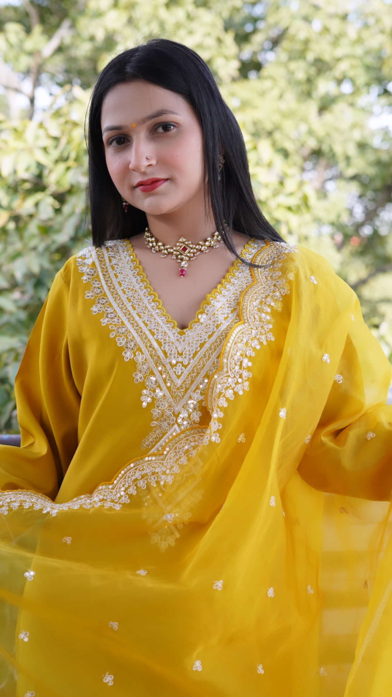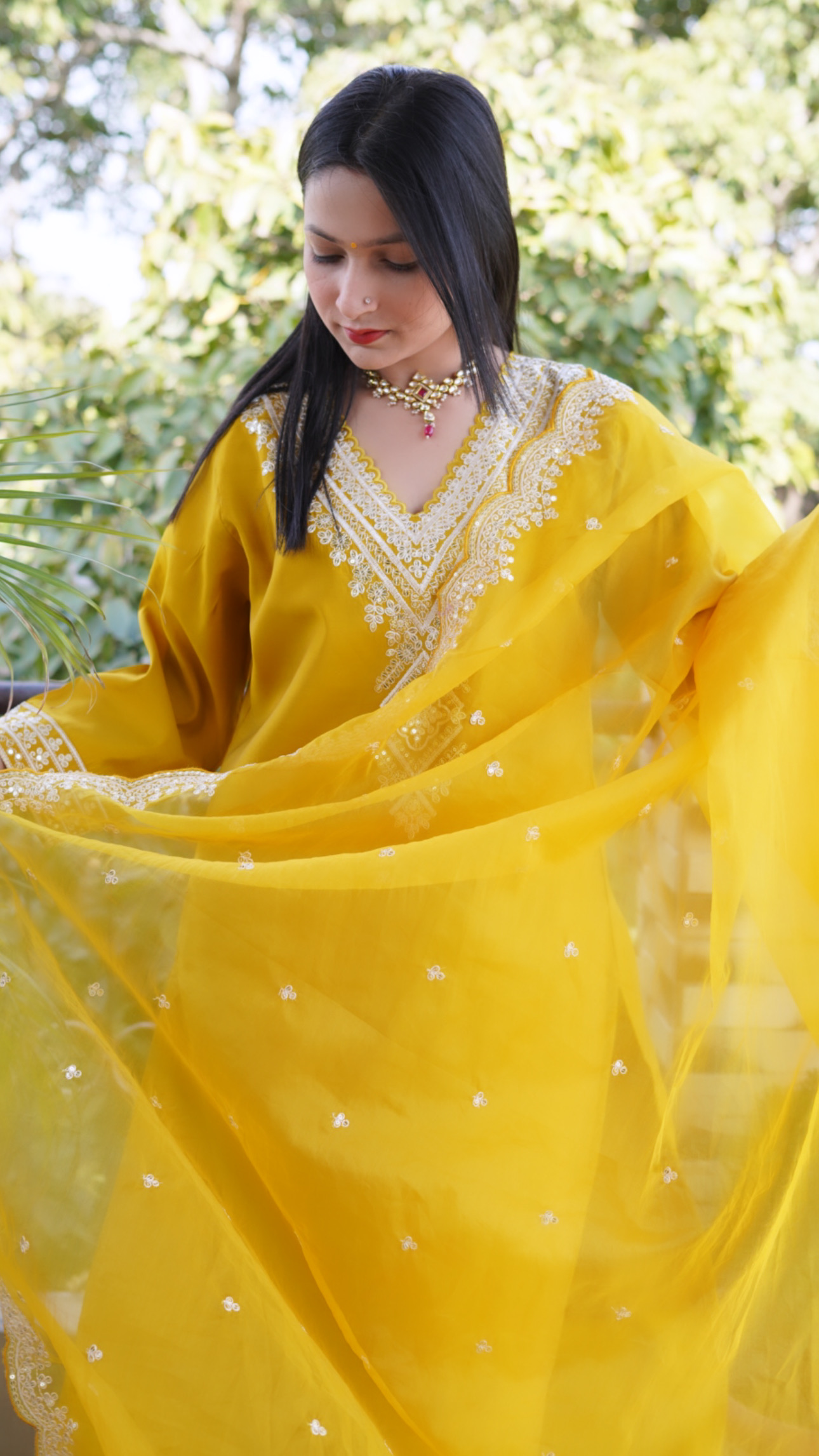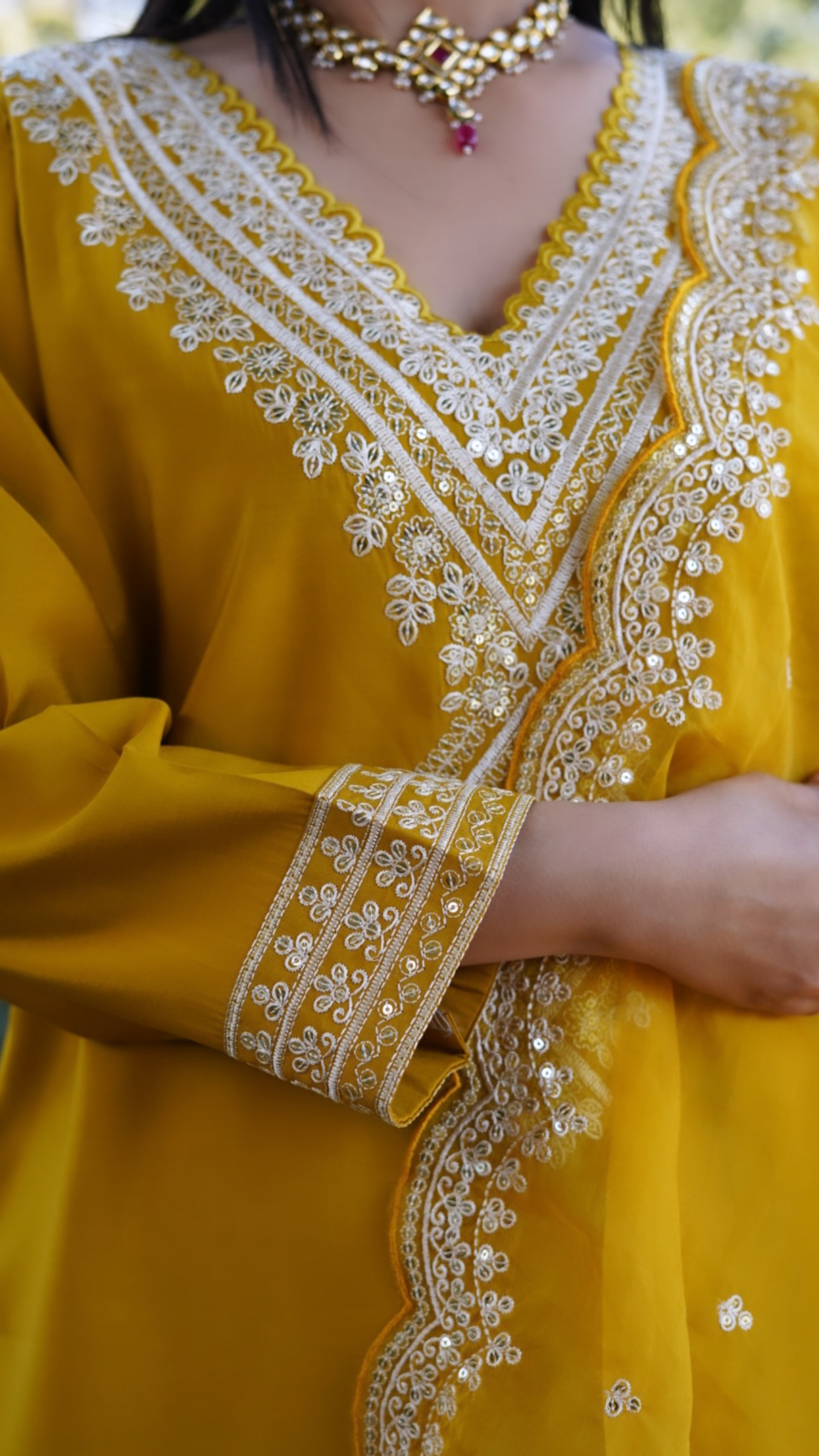 - It is paired with matching pants and organza embroidered dupatta.